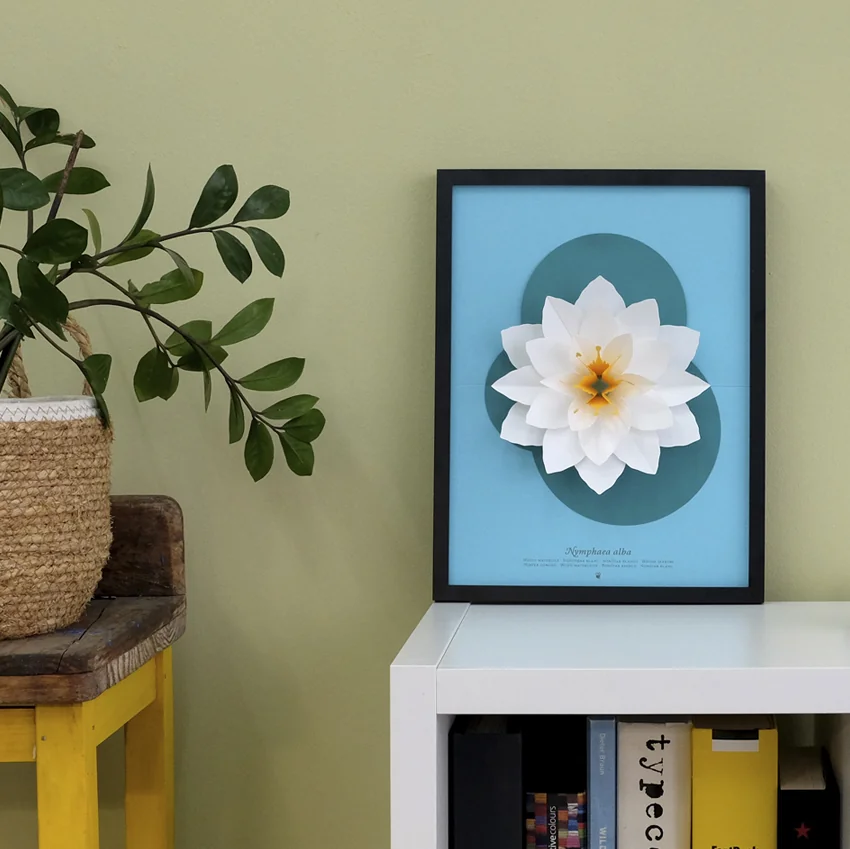 Además del pop-up, recibirás una ilustración artística en formato A4 del nenúfar blanco, perfecta para enmarcar o usar como referencia botánica.